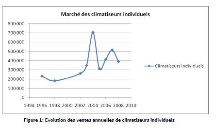 Pour l'année 2010, il y a eu enviorn 380 000 climatiseurs, ce qui correspond au niveau de ventes de 2008. 474 000 climatiseurs ont été vendus en France en 2004